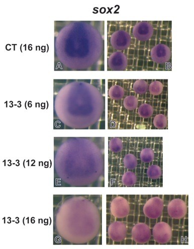 Supplementary Fig. 1. Effects of ADAM13 knockdown on sox2 expression. One-cell stage embryos were injected with the indicated amount of control (CT) MO or MO 13-3, and cultured to stage 13/14. In situ hybridization was carried out for sox2. A representative embryo of each group is shown in the left panels (anterior views with dorsal at the top), and multiple embryos of the same groups are shown in the right panels.