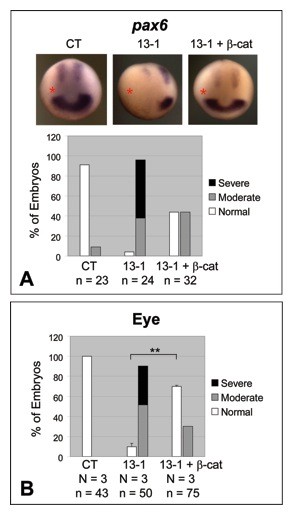 Supplementary Fig. 6. The effects of ADAM13 knockdown on pax6 expression and eye morphology can be rescued by exogenous β-catenin (β-cat). One dorsal-animal blastomere of 8-cell stage embryos was injected with the indicated MO (1.5 ng) together with or without β-cat transcript (50 pg). Embryos were processed for in situ hybridization for pax6 at stage ~12.5 (A), or scored for eye defects at stage ~35 (B). The injected side is denoted with a red asterisk. See Fig. 1A and Materials and Methods for phenotype scoring. **, p < 0.001.