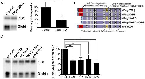 Figure 2. Overexpression of both wild type and mutant forms of xFOG inhibit primitive erythropoiesis.(A) Northern blot of globin expression in tailbud stage embryos in which wildtype xFOG RNA was injected into the VMZ of eight-cell embryos (n = 8). (B) Schematic of MYC epitope tagged wild type and mutant xFOG isoforms. The MYC tag is in blue, the NuRD binding domain in red, the CtBP binding domain in yellow and the zinc fingers are in grey. (C) Northern blot of globin expression in tailbud stage embryos that overexpress mutant forms of xFOG RNA injected into the VMZ of eight-cell embryos (n≥4). Levels of globin expression are normalized to expression of ODC and reported as a percentage of control. Error bars reflect S.D. Paired t test results are as follows: ***, p≤0.0005; *, p≤0.05. ΔN = xFOGΔNuRD, ΔC = xFOGΔCtBP, ΔNΔC = xFOGΔNuRD/ΔCtBP, 4ZM = xFOG4ZM.