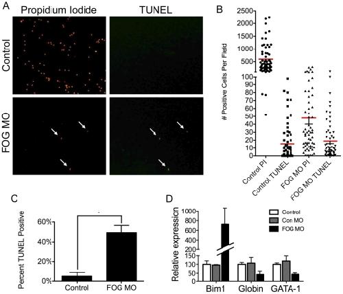 Figure 5. Loss of circulating RBCs in FOG morphants is due to increased apoptosis.(A) TUNEL staining of circulating blood cells. White arrows indicate cells that are both propidium iodide and TUNEL positive. (B) Scatter plot showing the distribution of numbers of propidium iodide (PI) and TUNEL positive cells per high-power field in blood from uninjected control and FOG MO injected embryos. Red bars indicate the mean (n = 3). (C) Graph of the number of TUNEL positive cells as a percentage of total (propidium iodide positive) cells in uninjected control and FOG MO injected embryos. (D) qPCR measuring expression of Bim1, globin and GATA-1 in FOG MO injected embryos at the tailbud stage. Expression is normalized to expression of ODC and reported as percent of uninjected control (n = 3). Error bars reflect S.D. for both Northern and qPCR analyses. Paired t test results are as follows: *, p≤0.05.