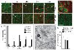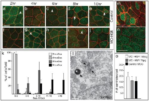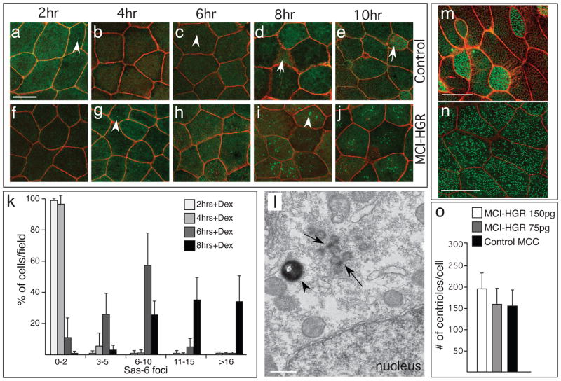 Figure 4. MCI induced centriole assembly(a–j) Shown are confocal images of the skin of control (a–e) or MCI-HGR RNA injected embryos (f–j), also expressing SAS6-GFP (green) and mRFP(red). Embryos were treated with DEX at stage 11.5, followed by fixation at the time intervals indicated. In control embryos, Sas6-GFP lightly labels centrioles (a,c arrowhead) in outer cells and basal bodies/centrioles in MCCs (d,e, arrow). By contrast, large bright Sas6-GFP foci are induced in outer cells by MCI-HGR (g,i arrowhead). Scale bar (a)=20microns (k) Plot showing the average fraction of cells (±s.d.) per field with different SAS-GFP foci number at the indicated time point, based on twelve fields taken from four embryos injected with MCI-HGR RNA. In control embryos, every outer cell scored contained 0–2 centrioles labeled with Sas6-GFP (data not shown). (l) Shown is a TEM image taken of an embryo injected with MCI-HGR RNA and treated with DEX for 8hrs. Structures similar to deuterosomes (arrows) in a pigmented (arrowhead) outer cell are located apical to the nucleus. Scale bar=500nm. (m–n) Shown are confocal images of the skin in embryos injected with mRFP and Hyls1-GFP RNA to mark cell boundaries (red) and centrioles (green), respectively, either alone (m) or with MCI-HGR RNA (n). At stage 11.5, embryos were treated with Dex, and then fixed at stage 28. Scale bars= 20microns (o) The average centriole number per cell (±s.d.) is plotted for control and MCI-HGR expressing embryos, using data obtained by scoring cells in at least three fields from five embryos. The slight increase in basal body number obtained with 150pg is significantly different (p<0.05) from control MCCs. |