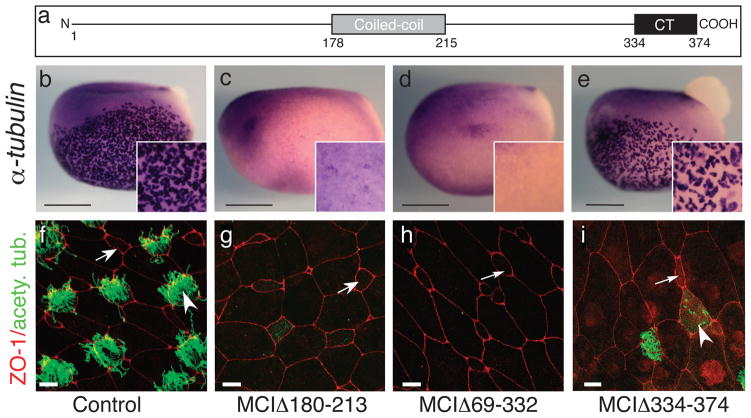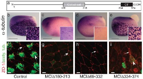 Figure 6. Domains required for MCI function(a) Diagram of MCI. (b–e) Shown are embryos injected with RNA encoding different MCI mutants as indicated, fixed at stage 13/14, and stained for α-tubulin RNA expression (f–i) Confocal images of the skin of embryos injected with RNA encoding different MCI mutants, fixed at stage 28, and stained with ZO-1 (red) and acetylated tubulin (green) antibodies to label cell boundaries and cilia, respectively. Scale bars=0.5mm (b–e), 10 microns (f–h), or 20 microns (i). |