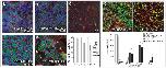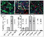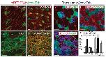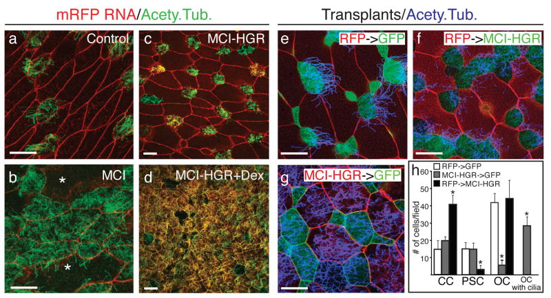 Figure 2. MCI induces MCC differentiation(a,b) Confocal images of the skin in embryos injected at the two-cell stage with MT-MCI and mRFP RNA (b) or mRFP RNA alone (a), fixed at stage 28, stained with an acetylated tubulin antibody to label cilia (green). Asterisks in b denote unusually large cells. (c,d) Confocal images of the skin in embryos injected with MCI-HGR RNA along with mRFP RNA as a tracer treated with DEX at stage 11.5 (d), and then fixed at stage 28 and stained for cilia (green). (e–g) The outer epithelium from donor embryos injected with mRFP RNA (red) was transplanted onto host embryos injected with mGFP RNA (green) as illustrated in Fig. 1g. Host (f) and donor (g) embryos were also injected with MCI-HGR RNA. Embryos were treated with DEX at stage 11.5 and fixed at stage 28. Shown are confocal images of a control transplant (e), a transplant onto a host injected with MCI-HGR RNA (f), or a transplant from a donor injected with MCI-HGR RNA (g), after staining for cilia (blue). (h) Cell types in the skin were scored as MCCs (green with blue cilia staining), PSCs (green with no cilia staining), outer cells (red), or outer cells with cilia (red with blue cilia). Data is presented as an average of 10–15 fields (±s.d.) obtained from at least three transplants where the asterisks denote experimental values significantly different from control values (p<.005). Scale bars =20microns |