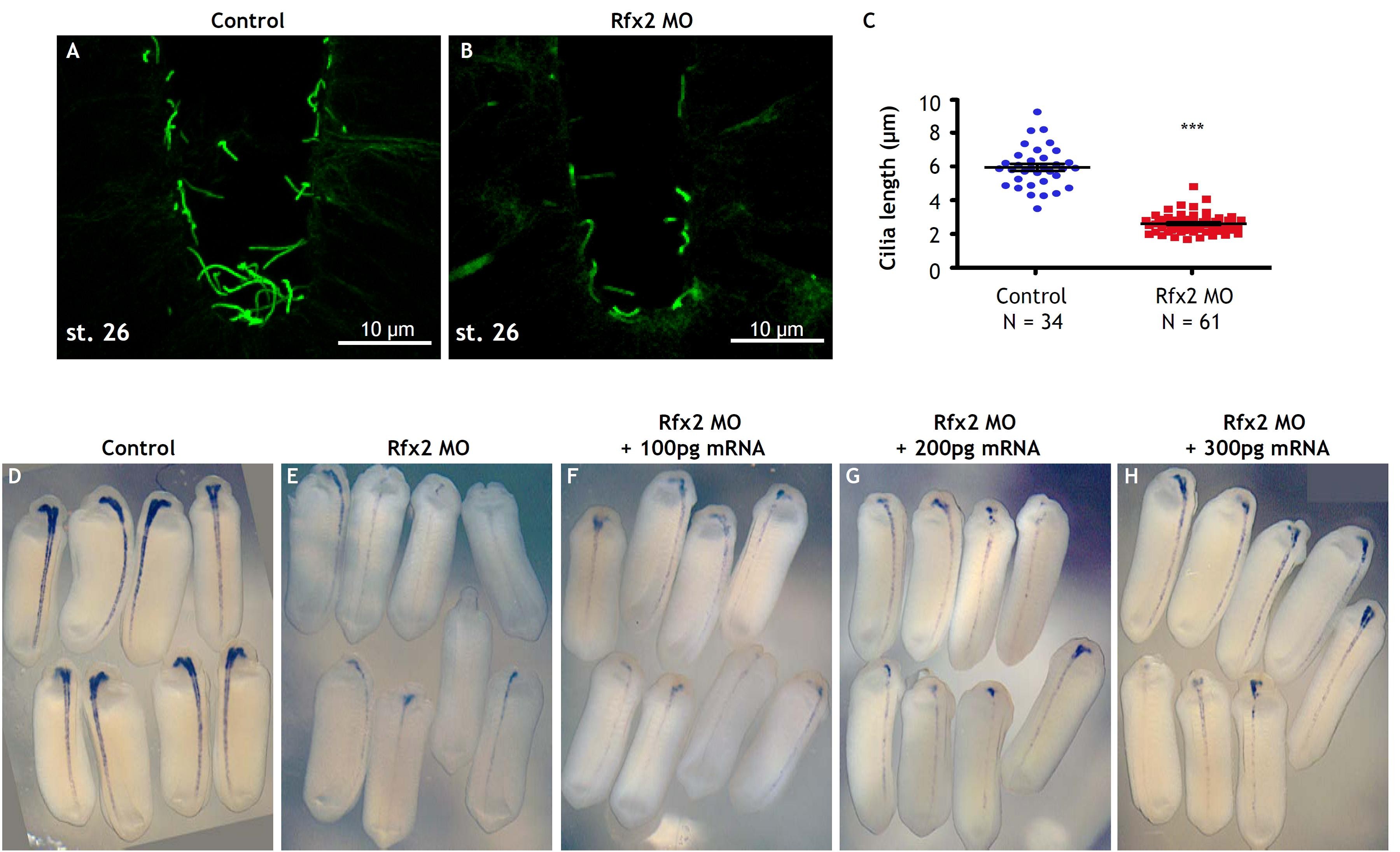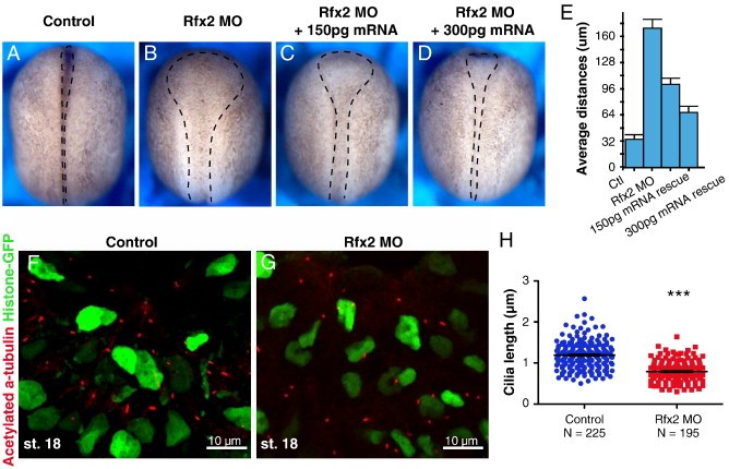 Fig. 2. Rfx2 is required for neural tube closure and proper neural cilia formation. (AâD) Stage 19 embryos, dorsal view, anterior top. Black dashed lines outline the distance between the neural folds. (A) Stage 19 control embryo. The neural tube is almost closed. (B) Embryo injected with Rfx2 morpholino dorsally. The neural tube closure defects are shown. The neural tube closure defects caused by disruption of Rfx2 can be partially rescued by co-injection with 150 pg GFP-Rfx2 mRNA (C) and 300 pg GFP-RFX2 mRNA (D). The average distance between the neural folds is shown in (E). (F) Transverse section view of neural plate of stage 18 control embryos. Cilia are stained with acetylated α-tubulin. (G) Transverse section view of neural plate of Rfx2 morphants. Shorter cilia are observed. (H) Cilia were measured in 15 μm projection confocal images. The average length of control cilia is 1.19±0.021 μm (mean±SEM, n=225). However, the average length significantly reduces to 0.79±0.016 μm in Rfx2 morphants (mean±SEM, n=195). Horizontal lines indicate the mean, vertical lines SEM, *** pb0.0001 MannâWhitney test. |