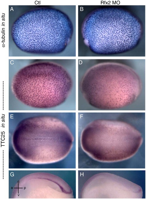 Fig. 6. Rfx2 is required for the expression of a ciliary gene TTC25, but not α-tubulin. (A)â(D) Rfx2 morpholino is injected into one ventral blastomere at the 4 cell stage. (A) α-tubulin in situ hybridization on the control side of epidermis. (B) α-tubulin in situ hybridization on the Rfx2 morpholino-injected side. α-tubulin expression is not significantly changed (also see suppl. Fig. 4). (C) TTC25 expression patterns on control epidermis. (D) TTC25 in situ hybridization on Rfx2 morpholino-injected side of epidermis. TTC25 expression is reduced in epidermal multi-ciliated cells. (E)â(H) Rfx2 morpholino is injected into both dorsal blastomeres at the 4 cell stage. (E) Dorsal view of TTC25 expression on neural plate of a control embryo. (F) Dorsal view of TTC25 expression on neural plate of an Rfx2 morphant. TTC25 expression is reduced. (G) Sagittal section view of a control embryo. TTC25 is expressed in the gastrocoel roof plate (GRP). (H) Sagittal section view of a Rfx2 morphant. TTC25 expression is reduced in GRP. |