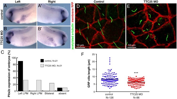Fig. 8. Rfx2 is required for GRP cilia assembly and the leftâright asymmetry. (AâB) Pitx2c expression at stage 26, lateral view. In wildtype embryos, Pitx2c is expressed in the left LPM (A, Aâ², C). In TTC25 morphants, only 33% of embryos show normal left LPM expression (C), and Pitx2c is often expressed in the right LPM (Bâ², C). (DâE) Confocal images of the posterior GRP (node) stained with acetylated α-tubulin to visualize cilia and injected with membrane-RFP to outline cells. (F) GRP cilia were measured in confocal images as in D, E for 5 embryos each. Horizontal lines indicate the mean, vertical lines SEM, pb0.0001 MannâWhitney test. |