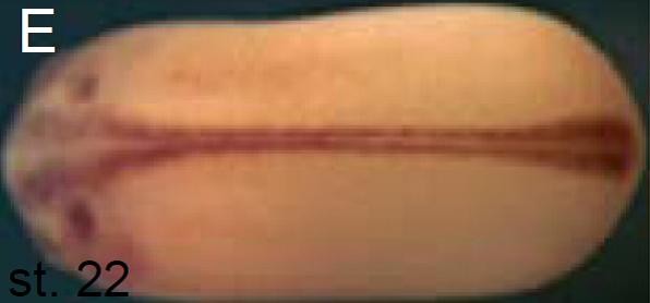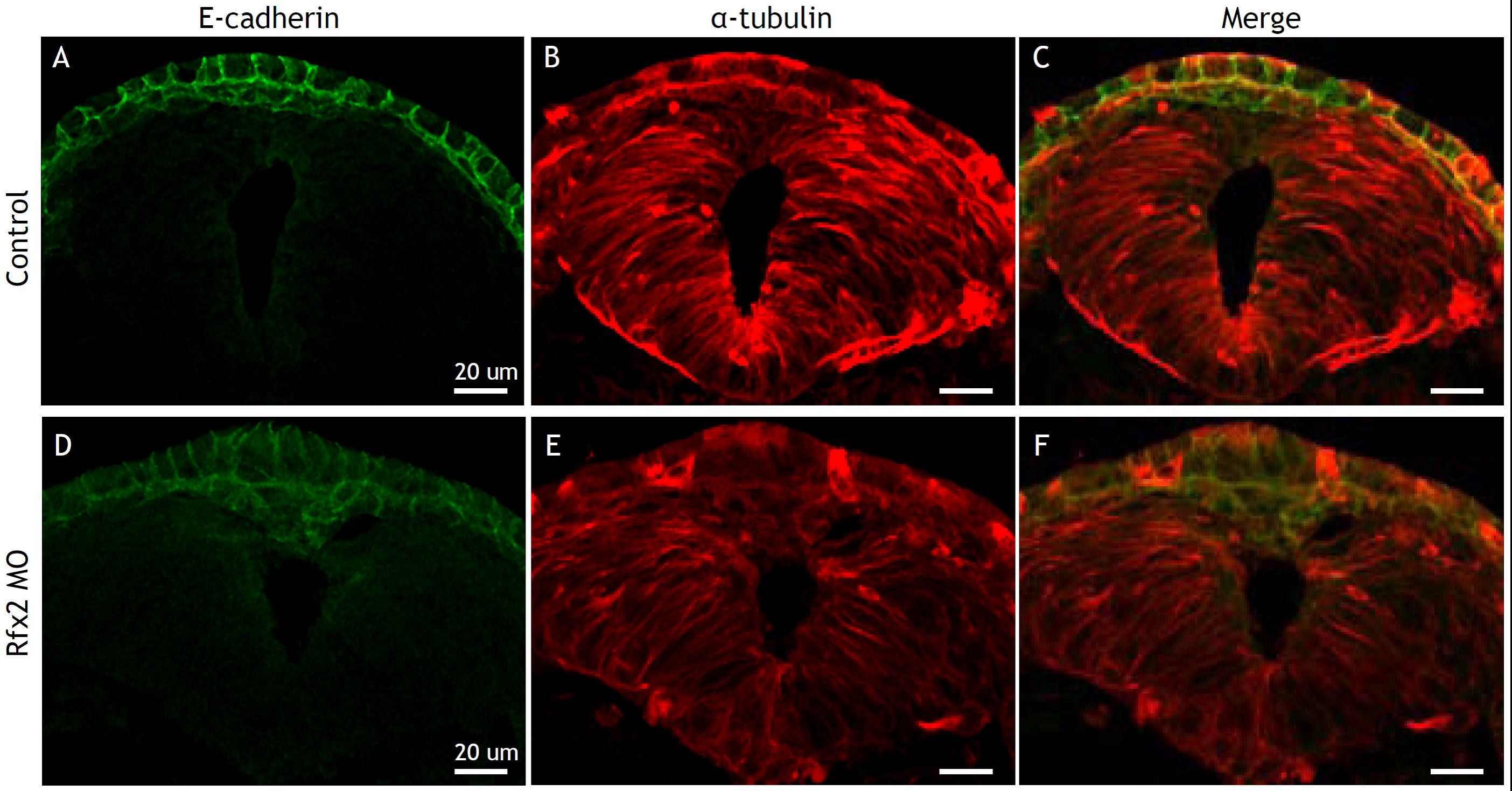 Suppl. Fig. 3. Rfx2 is required for neural tube closure. (A) Transverse section view of st. 24 control embryos. Epidermis is stained with E-cadherin. (D) Transverse section view of Rfx2 morphants. While dorsal epidermis had fused over the neural tissue, the neural epithelium had not properly fused into a tube. |
