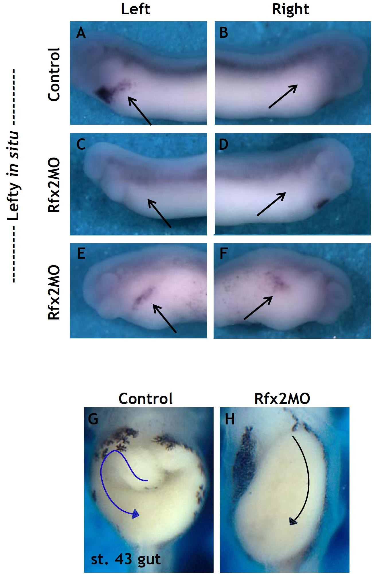 Suppl. Fig. 5. Loss of Rfx2 causes leftight asymmetry defects. (A) Lefty in situ hybridization, lateral view. In control embryos, Lefty is expressed in the left LPM (A), but not in the right LPM (B). In Rfx2 morphants, Lefty expression is absent (C, D) or bilateral (E, F). (G, H) Ventral view of st. 43 gut. Control gut asymmetrically loops (G), but fail to loop properly in Rfx2 morphants (H). |
