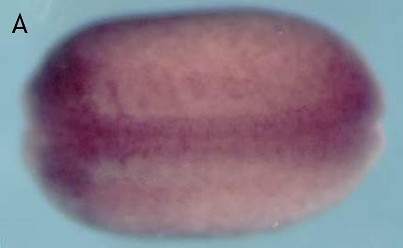 rfx1 (regulatory factor X, 1) gene expression in Xenopus laevis embryos, NF stage 16, as assayed by in situ hybridization, dorsal view, anterior left. |
