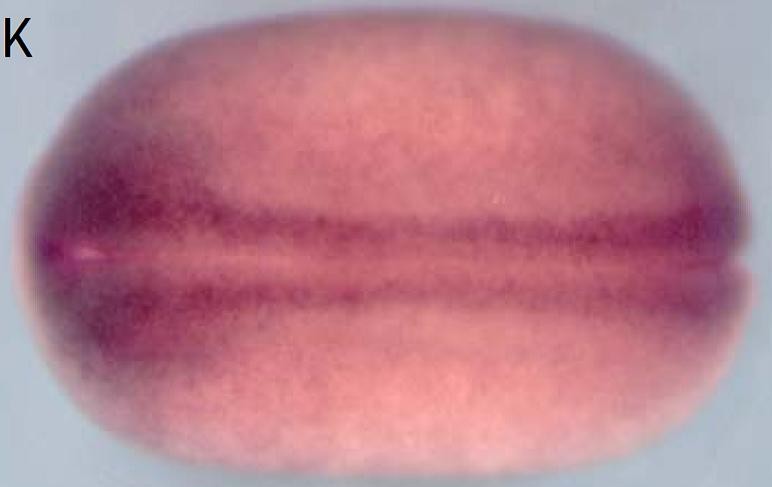 Fig. 1. Rfx2 is expressed in ciliated tissues. (A) Early expression of Rfx2 in epidermis. (B) Rfx2 is expressed in the neural plate. Dorsal view. (Bâ²) (C) Sagittal sections showed that Rfx2 is expressed in the gastrocoel roof plate (GRP) (arrows). BP: blastopore. (D) Transverse section view revealed robust Rfx2 expression in the neural tube. (E) Rfx2 is expressed in the neural tube. Dorsal view. (F) Rfx2 is expressed in otic vesicles and kidneys. (G) Punctate expression of Rfx2 in the epidermis. (H) Closer view of epidermal Rfx2 expression in (G). (I) Epidermal ciliated cells are observed by staining with α-tubulin. Ciliated cells are co-localized with Rfx2 in situ pattern in (H). |