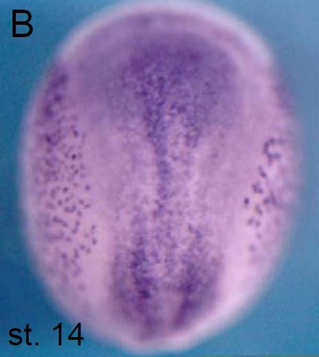 rfx5 (regulatory factor X, 5) gene expression in Xenopus laevis embryos, NF stage 16, as assayed by in situ hybridization, dorsal view, anterior left. |