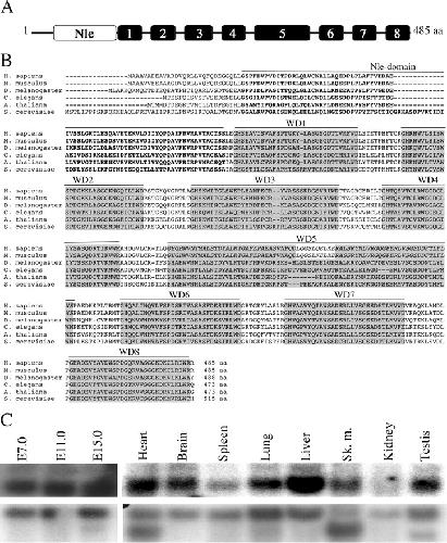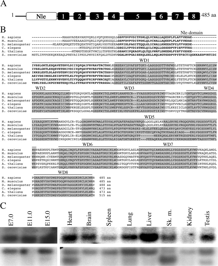 FIG. 1. Structure and amino acid alignments of mNle protein and expression pattern of mNle transcripts. (A) Schematic representation of the mNle protein containing a single Nle domain (white box) at its amino-terminal region and eight WD40 domains (gray boxes). (B) Alignments of sequences of Nle orthologs by clustalW. Using the website at http://bmerc-www.bu.edu/wdrepeatto search for WD40 domains, eight domains were predicted for Nle in Saccharomyces, Xenopus, and Drosophila, whereas nine domains were predicted for mouse and human Nle proteins. Based on amino acid sequence comparisons and on the fact that, in mouse and human, the fifth domain does not end by a consensus WD motif and that the sixth domain does not begin by a consensus GH sequence, we propose that the fifth and sixth predicted WD40 domains of the human and mouse Nle proteins correspond to a single WD40 domain (in italics), as predicted for other species. GenBank/EMBL accession numbers for the Nle orthologous sequences are as follows: Homo sapiens, NP_060566; Mus musculus, NP_663406; D. melanogaster, NP_477294.1; C. elegans, NP_493745; Arabidopsis thaliana, NP_200094.1; and S. cerevisiae, NP_009997. Amino acids corresponding to the Nle domain are in boldface type. WD40 repeat domains are highlighted in gray boxes. The numbers of amino acids (aa) are indicated at the end of the sequences. (C) Northern blot analysis of poly(A)+ mRNAs of embryos at E7.0 to E15.0 and various adult tissues hybridized with an mNle-specific probe (upper panel) or a β-actin probe (lower panel). |