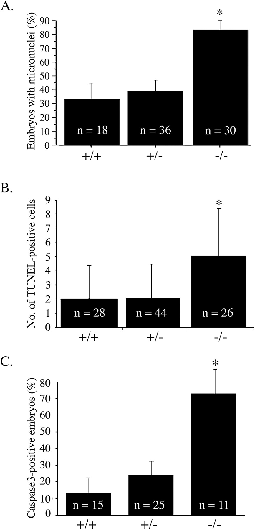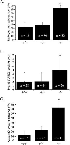 FIG. 7. Apoptosis in E3.5 blastocysts from mNle+/− intercrosses cultured for 24 h. (A) Percentage of mNle+/+, mNle+/−, and mNle−/− embryos yielding micronuclei detected by Hoechst reagent staining (n = 84; P < 0.001, χ2 test). Data ± standard errors of the means (bars) are shown. (B) A twofold increase of TUNEL-positive cells was observed in mNle−/− blastocysts compared with control counterparts (n = 90; P < 0.0001, ANOVA test). Data ± standard deviations (bars) are shown. (C) Percentage of mNle+/+, mNle+/−, and mNle−/− embryos positive for the active form of caspase 3 protein (n = 51; P < 0.01, χ2 test). Data ± standard errors of the means (bars) are shown. Asterisks indicate statistical difference. |
