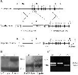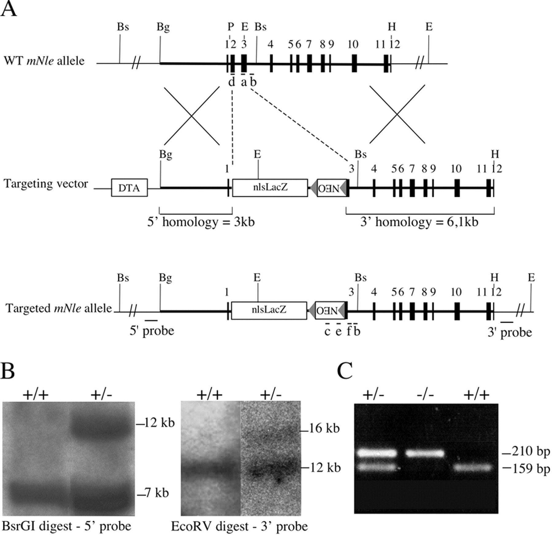 FIG. 3. Targeted disruption of the mNle gene. (A) Structure of the WT mNle allele, the targeting vector, and the targeted allele. Exons (solid boxes), LoxP sequences (triangles), and positions of primers used for genotype analysis (a to f, bars), probes used for Southern blot analysis (bars), and pgk-DTA and pgk-Neo cassettes used for negative and positive selection are indicated. Restriction sites relevant to the targeting construct and to the screening strategies are as follows: BglI (Bg), BsrGI (Bs), EcoRV (E), HincII (H), and PstI (P). (B) Southern blot analysis of genomic DNA obtained from wild-type and heterozygous ES cells. (C) Genotype analysis of early embryos from mNle+/â intercrosses. The first round of PCR used primers b, c, and d. The second round of PCR used primers a, e, and f, yielding amplification products of 159 bp and 210 bp for the wild-type and mutant alleles, respectively. |