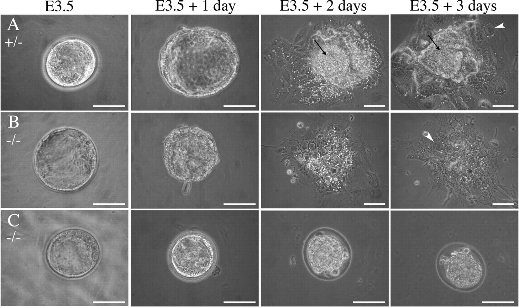 FIG. 4. Cultures of embryos derived from mNle+/− intercrosses. E3.5 blastocysts were harvested and cultured for 3 days. mNle+/+ and mNle+/− blastocysts (A) hatched from the zona pellucida after 1 day and attached to the culture dish. During the following days, the ICM proliferated (arrows) and the trophectoderm differentiated (arrowheads). mNle−/− blastocysts were indistinguishable from controls at E3.5 (B and C). After 24 h in vitro, most of them were unable to hatch from the zona (C) and degenerated rapidly. The remaining mNle−/− embryos hatched (B) and attached to the dish, and the trophectoderm expanded and differentiated (arrowhead). However, after 2 days in culture, the ICM degenerated and was no longer discernible. Bars, 50 μm. |