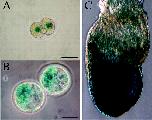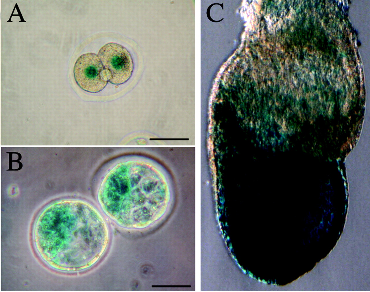 FIG. 5. nlsLacZ expression pattern in mNle+/− heterozygous early embryos. X-Gal staining was performed on embryos harvested from crosses of wild-type females and heterozygous males at E1.5 (A), E3.5 (B), and at late bud stage (C). Scale bars, 50 μm. |