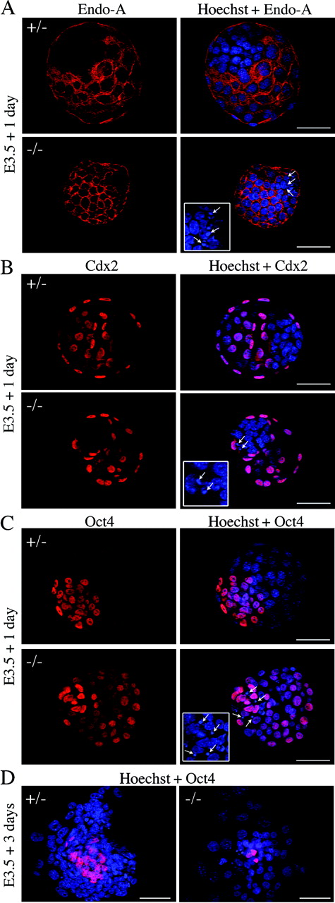 FIG. 6. TE and ICM specification in E4.5 blastocysts and outgrowths from mNle+/â intercrosses. Immunohistochemical detection of cytoplasmic Endo-A cytokeratin (red) (A) and nuclear Cdx2 (red) (B), specific for TE, and nuclear Oct4 (red) (C), specific for ICM, in mNle+/â and mNleâ/â embryos is shown. Representative control embryos (upper panel) and mNleâ/â embryos (lower panel) are shown. (D) Oct4 expression in mNle+/â and mNleâ/â outgrowths from blastocysts cultured for 3 days. In mNle+/â outgrowths, Oct4-positive immunostaining was detected in the ICM. In contrast, very few Oct4-positive cells were observed in mNleâ/â outgrowths. Nuclei were counterstained with Hoechst stain (blue). One optical section is shown for panels A to C (flattened blastocyst morphology was due to mounting on one slide with a glass coverslip placed over it). Micronuclei were detected in the ICM of the mNleâ/â blastocysts (white arrows and insets, panels A to C). Bars, 50 μm (panels A to C) and 200 μm (panel D). |