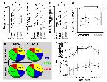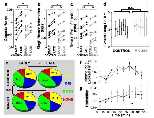 Figure 4. Effects of visual training on single-neuron response properties.(a) Tuning curve dynamic range, the fraction by which a neuron's firing changes in response to different stimuli during early and late epochs. (b,c) Stimulus mutual information conveyed by single neuron (b) and neuron pair (c) firing patterns. Upper asterisks denote difference in the change with treatment. Lower asterisks denote significant change across epochs (paired t-test). (d) Evoked firing rates in control (black) and MK-801 treated (gray) tadpoles during first hour of stimulation. Each point corresponds to a single tadpole; error bars denote standard deviation across neurons within a given tadpole. MK-801 does not acutely affect evoked firing rates (t-test, pâ=â0.61). (e) Proportion of neurons showing direction (yellow), orientation (blue), both (green), or neither (red) selectivity in control (top) and MK-801â(bottom) treated tadpoles, in the first (left) and second (right) hour of stimulation. Asterisks denote significant change across epochs (paired t-test). (f,g) Mean normalized amplitude (f) and response reliability (g) over the course of visual training (black). Reliability increased with training (ANCOVA, p<0.01). Neither measure was affected by MK-801 (gray) (ANCOVA, p>0.05). Reliability is the proportion of evoked responses with amplitude larger than the median spontaneous firing rate. Error bars denote SEM. *p<0.05. |