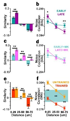Figure 7. Training strengthens clustering of receptive fields and network correlations.(a–d) Tuning curve similarity (a,c) and mean noise correlation (b,d) of neuron pairs binned by spatial distance, during early (teal) and late (purple) epochs, in control (a,b) and MK801-treated (c,d) tadpoles. (e,f) Tuning curve similarity (e) and noise correlations (f) in tadpoles trained with four stimuli (0°–135°), binned by distance, in response to trained (orange) and untrained (yellow) stimuli. (f) Shaded area highlights the range of plots in (b,d). Noise correlations to untrained stimuli were significantly lower than in naive control animals (p<10−5, two-way ANOVA) and those to trained stimuli were significantly higher than in naive controls (p<10−5, two-way ANOVA). Error bars denote SEM. Control, n = 7 tadpoles (277 neurons), MK801, n = 7 tadpoles (255 neurons) (e,f) n = 3 tadpoles (152 neurons). *p<0.05; **p<0.01. |