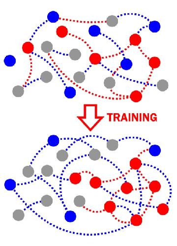 Figure 9. Schematic of receptive field and noise correlation plasticity for trained (red) and untrained (blue) stimuli.Tectal neurons are represented as circles, circle color marks preferred direction (red, down; blue, up), and dotted lines represent noise correlations. Training with down direction increases and clusters receptive fields oriented toward the trained stimuli and decreases long-distance noise correlations (dashed lines). Receptive fields preferring untrained stimuli (blue) are reduced, and noise correlations to these stimuli are increased on all spatial scales. Note that noise correlations can differ across stimuli and are not necessarily determined by neurons' preferred directions. |