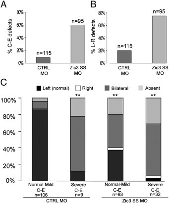 Fig. 8. Correlation between C-E morphogenesis and LâR patterning. (A) Percentage of control morphant (CTRL MO) and Zic3 morphant embryos with defective C-E phenotypes. (B) Percentage of control and Zic3 morphants with LâR patterning abnormalities. (C) Comparison of control and Zic3 morphants with defective C-E (score based on scale represented in Fig. 1D) and abnormal LâR patterning (based on pitx2 expression in the lateral plate mesoderm). C-E defects are categorized as normal to mild (C-E score of 1â3) and severe (C-E score of 4â5). **p < 0.01 by Fisher's exact test; statistical significance was determined through comparison of each experimental group with the CTRL MO (normalâmild CE) group.