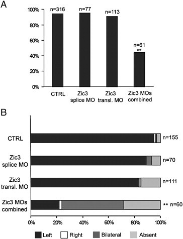 Supplemental Fig. 1. Xenopus Zic3 morpholino specificity. To demonstrate specificity, Zic3 morpholinos were injected singly at 2.65 ng, a dose not producing a phenotype. When injected together at a dose of 2.65 ng each, the morpholinos recapitulate the convergent extension and L phenotypes. (A) Percentage of embryos with normal convergent extension. (B) Percentage of embryos with normal L as assayed by pitx2 expression. **p < 0.0001 by Fisher's exact test; statistical significance was determined through comparison of each singly injected morpholino group with combined morpholino group.