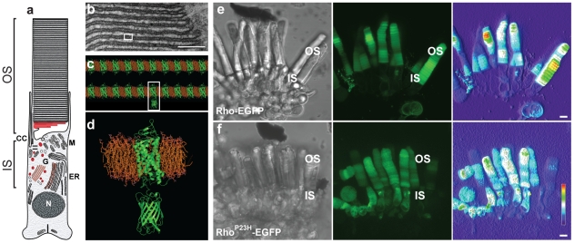 Figure 1. Expression of RhoP23H-EGFP in transgenic Xenopus.(a) Schematic drawing (left) of the Xenopus rod photoreceptor. The inner (IS) and outer (OS) segments, the nucleus (N), the prominent endoplasmic reticulum (ER), Golgi (G), connecting cilium (CC) and mitochondria (M) located apically in the IS are shown. The OS contains numerous stacks of disk membranes. (b) A segment of OS is shown in an electron micrograph. Scale bar, 100 nm. (c) A molecular model of the OS disk membrane (from a segment of a single disk, white box in b). The density of rhodopsin, approximately 90% of the protein in the OS disk membranes [32] is illustrated to scale in the molecular homology model based upon the high-resolution bovine rhodopsin structure [33]. The rhodopsin-phospholipid molar ratio is presented to scale. (e, f) Representative images of sections of live Xenopus retina showing rod cells expressing either Rho-EGFP (e) or RhoP23H-EGFP (f) The DIC image of a small piece of retina (left) and the corresponding three dimensional rendering of a confocal laser scanning z-stack using EGFP detection (middle) are shown. The outer and inner segments are labeled. To illustrate the range of transgene expression, a concentration heat map (red, maximum intensity) is shown (right). Scale bar, 5 µm.