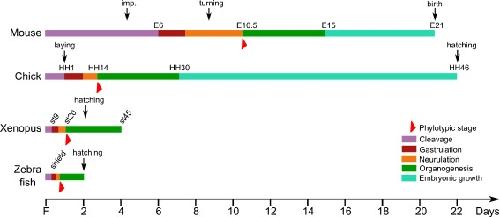 Fig. 1. Comparative embryogenesis of the mouse, chick, Xenopus and zebrafish. After fertilization (F), these four vertebrates undergo similar phases during their embryonic life. Species-specific stages are indicated on the figure. Briefly, Mouse embryos will implant (imp) at E4.5, after formation of the blastocyst and separation between the epiblast (or primitive ectoderm), at the origin of the embryo, and the cells which will give rise to the extra embryonic structures, the trophoectoderm and the primitive endoderm. The turning process, at E9, allows the establishment of the dorsal and ventral axis. The organogenesis is followed by the embryonic or foetal growth phase and birth takes place between 18 to 21Â days after fertilization, depending on the mouse strain. The cleavage phase of the Chick embryos takes place in the hen oviduct. After laying, gastrulation and neurulation are complete in 2Â days and stage HH14 is characterized by the existence of 22 somites. Feather germs appear at stage HH30 and organogenesis and embryo growth continue till hatching 22Â days after fertilization. Cleavage of Xenopus embryos will be complete by stage 9, blastula stage and neurulation starts at stage 12.5 and ends at stage 20. First somite is formed at stage 17. Organogenesis is the longest phase, characterized by the hatching of the embryos from their vitelline membrane around stage 25. After stage 45, the tadpole will start feeding and will undergo the metamorphosis phase before becoming an adult frog. Zebrafish embryos display the quickest embryonic life cycle. Cleavage divisions lead to the formation of a blastoderm lying over the yolk, at the sphere stage, 4Â h after fertilization. Gastrulation starts 5.5Â h after fertilization, at the shield stage and is complete only 4.5Â h later. Somite formation and neurulation follow during the segmentation period. Organogenesis then takes place during the pharyngula period, less than 24Â h after fertilization, and zebrafish embryo usually hatches 48 to 72Â h after fertilization. The term larva is being arbitrarily used after the end of the third day, whether the hatching has taken place or not |