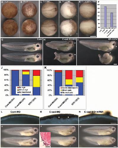 Fig. S1. Embryonic phenotype produced by C-cad-MO or EPDC. (A-F) Disintegration of embryos. Animal views of midgastrula (A,B) or neurula (C-E) embryos. Disintegration is seen after injection with EPDC mRNA (4 ng; B) or C-cad-MO (40 ng/embryo; D). (F) Fraction of disintegrated embryos. Effect of C-cad MO is rescued by C-cad mRNA (1 ng/embryo), although development remains delayed (E,F). (G-K) Head and axis formation in tailbud embryos after injection into dorsal mesoderm region. C-cad-MO (40 ng/embryo) or EPDC (0.5ng/blastomere) was injected into 8-cell dorso-vegetal blastomeres, which are fated for anterior mesendoderm, responsible for head induction, and for some posterior mesoderm engaged in axis formation. While EPDC injection inhibits head formation (arrowheads in I) with or without axis shortening, C-cad-MO injection reduces axis extension, but not head formation (arrowheads in H). (J) Rates of axis extension defect. (K) Rates of head defect, as seen from defective eye formation. (L-Q) Epithelial layer of ectoderm separates from inner layer at low dose of C-cad-MO. (L-N) Ectoderm in the gastrula (stage 11). Low level of C-cad-MO (10 ng/embryo) causes separation of outer and inner ectoderm layer (M, asterisks). (O-Q) This shows later as a tuft of wrinkled epithelium (arrows in P, inset shows histological section). Phenotypes were rescued by C-cadherin mRNA injection (N,Q). Scale bars: 500 um in E,G and Q, 100 um in N and P (inset). |