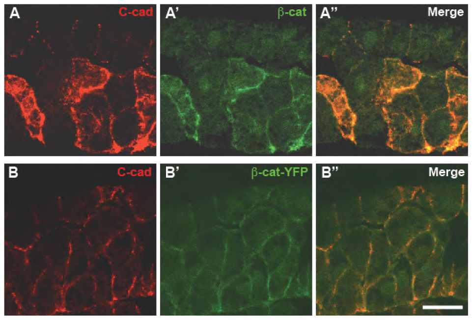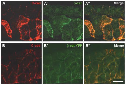 Fig. S3. Localization and density of C-cadherin coincide with that of b-catenin. (A-A0) Ectoderm expressing C-cadherin mRNA in a mosaic fashion was double-stained with anti-C-cadherin and anti-b-catenin antibody. (B-B0) b-catenin-YFP expressed in ectoderm cells was detected with anti-GFP antibody, in addition to C-cadherin. In both cases, expression of b-catenin follows that of C-cadherin. Apical to the top. Scale bar: 20 um. |