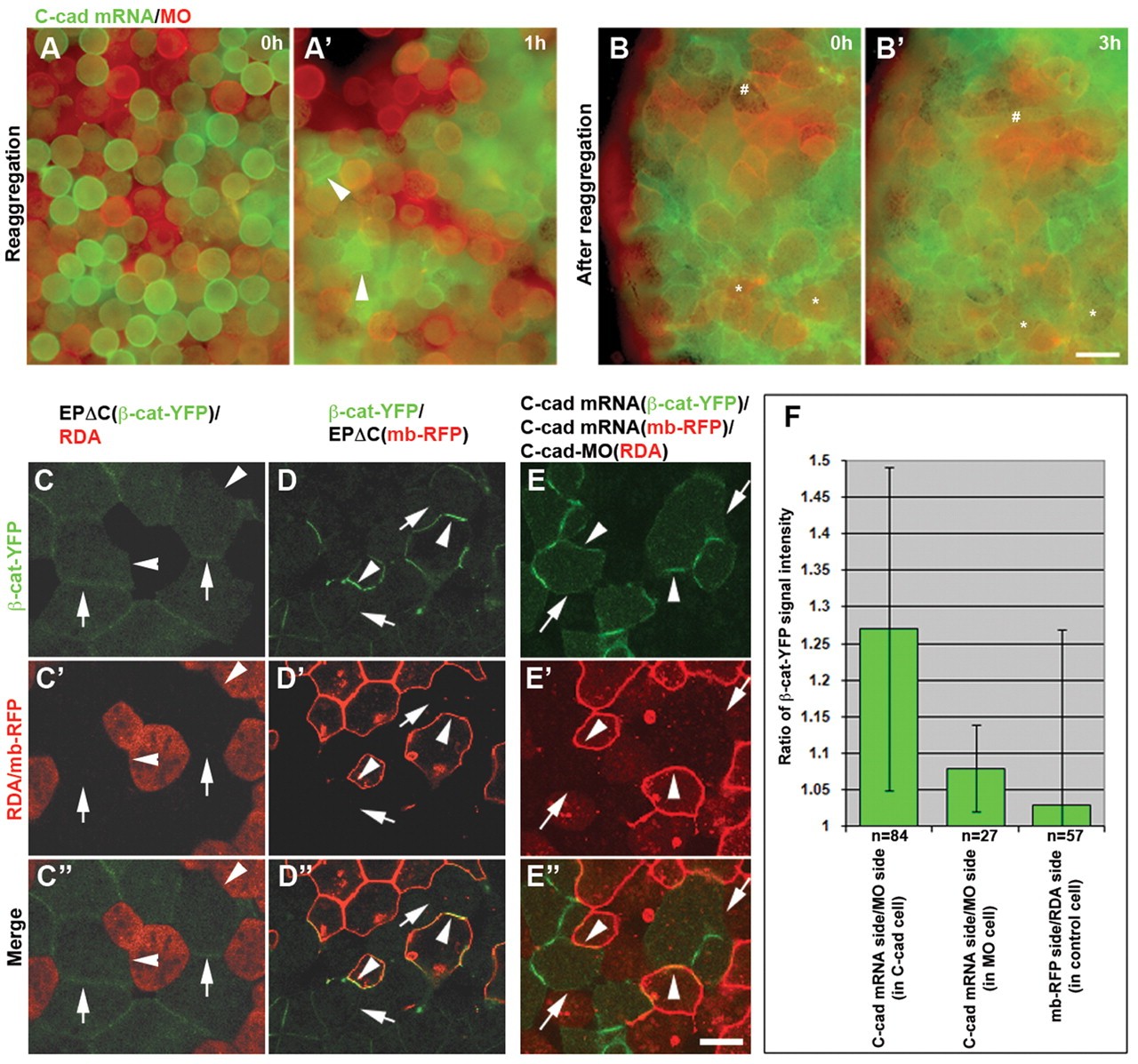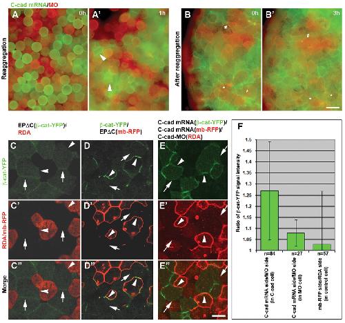 Fig.4. Cellular response to cadherin modulation. (AâBâ²) C-cad-MO (10 ng/embryo) and C-cadherin cells segregate during reaggregation (A,Aâ²), but not afterwards (B,Bâ²). (A) C-cadherin cells (green) establish early contacts (arrowheads, Aâ²), MO cells (red) remain round (Aâ²). (B,Bâ²) Random cell rearrangements, for example, deep C-cadherin cell moves to the surface (#) and surface C-cad-MO cells move inside (*), contrary to what would be expected from continued sorting. (CâF) β-catâYFP at the cell membrane varies with the amount of C-cadherin in adjacent cells. (CâDâ²) EPδC cells increase β-catenin when adjacent to normal cells (DâDâ², arrowheads and arrows), but not when adjacent to EPδC cells (CâCâ², arrowheads and arrows). (EâEâ²) In C-cadherin cells,β-catenin is more prominent at contacts with like cells (mb-RFP, arrowheads) than at those with C-cad-MO cells (RDA, arrows). Scale bars: 50 μm (Bâ²), 20 μm (Eâ²). (F) Quantification of β-catenin localization. Average pixel intensity was measured, and the ratio of intensities at contacts to high and to low cadherin cells was calculated for single cells for C-cadherin (left) and C-cad-MO (middle) cells. Ratio in controls shows no preference for sides (right). Left and middle bar, ratios significantly >1 (P<0.0001). |