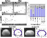 Fig.2. Adhesiveness of ectoderm cells. (AâC) Cells on C-cadherin-Fc substratum before and after dish inversion: (A,Aâ²) control MO-injected cells; (B,Bâ²) C-cad-MO cells (10 ng/embryo); (C) fraction of cells remaining attached. *Ratio significantly different from control condition (P<0.05). (DâG) Surface tensions of ectoderm. (D,F) Side view of aggregates after 2 hours. (E,G) Drop shapes (red lines) were fitted to scanned outlines of aggregates (blue) by axisymmetric drop shape analysis (ADSA). (D,E) Control; (F,G) C-cad-MO aggregates. |