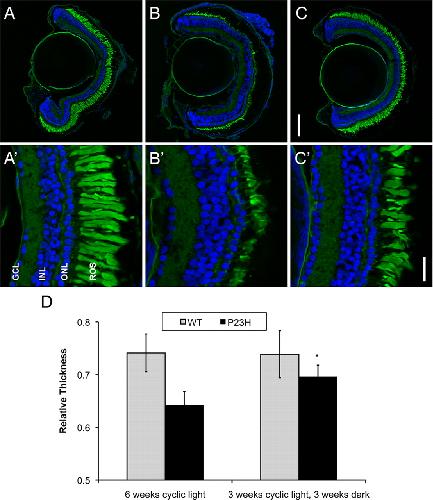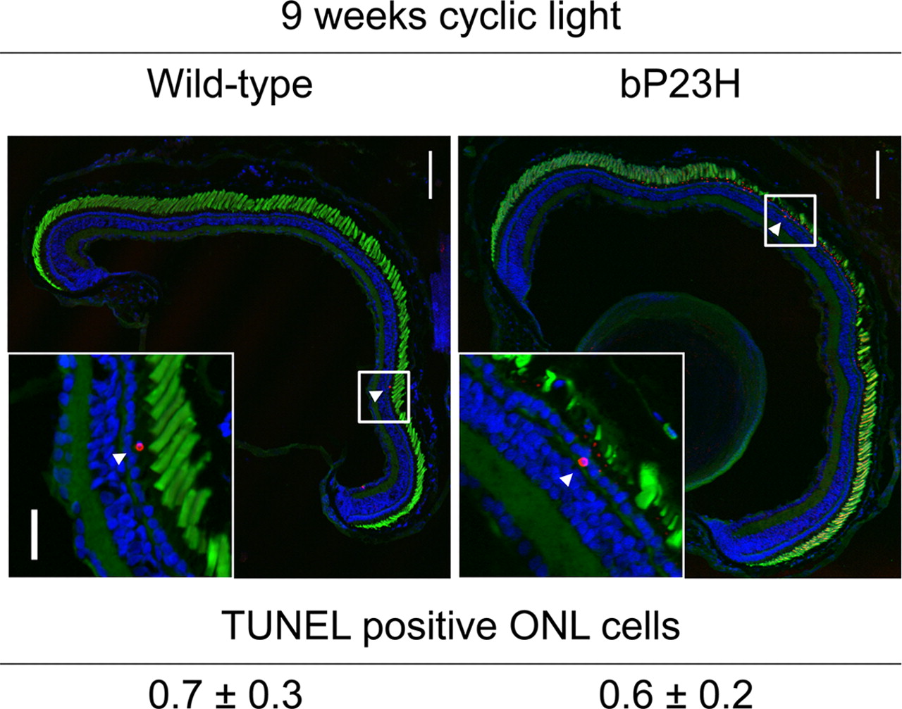Apoptosis in bP23H retinas reared in cyclic light is comparable with WT retinas in cyclic light. Comparison of wild-type retina (left) versus bP23H retina (right) after 9 weeks in cyclic light. The arrowheads point to TUNEL-positive (red) ONL cells. Insets show enlargements of respective boxed areas. The number of TUNEL-positive cells in the ONL were counted over a 9 week period. The highest number of TUNEL-positive ONL cells per section per retina at week 9 is shown (n > 3, mean ± SEM). WGA, Green; Hoechst nuclear stain, blue. Scale bars: 100 μm; inset, 10 μm. |