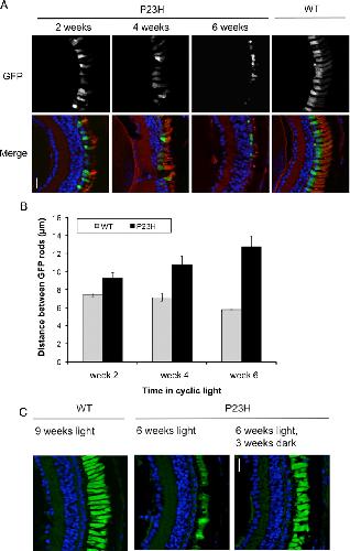 Dysmorphic rhoP23H rod cells are able to regenerate in the dark. A, Dysmorphic rod cells can be observed in the degenerating bP23H retina for up to 6 weeks in cyclic light-rearing conditions. Sections were stained with Alexa Fluor 555-conjugated WGA to visualize membranes (red) merged with Hoechst nuclear stain (blue). Rod photoreceptors were visualized by GFP expression (green). B, Relative density of GFP-positive rods in the central retina over time (n = 3, mean ± SEM). C, bP23H rod cells are able to regenerate outer segments lost after 6 weeks in cyclic light. Cessation of degenerating light signal reverses ROS degeneration. Sections were stained with WGA to visualize membranes (green) merged with Hoechst nuclear stain (blue). Scale bars, 20 μm. WT, Wild type. |