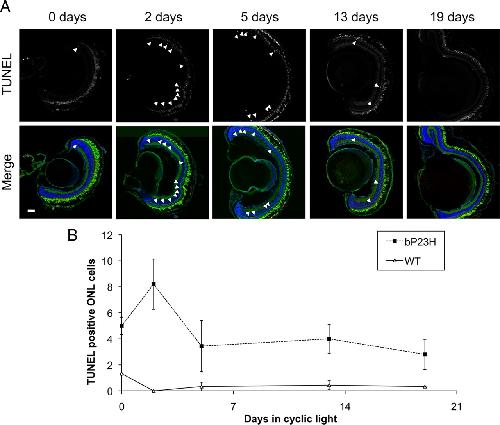 Short-term degeneration of bP23H retinas over a 3 week period as monitored by TUNEL. Tadpoles were allowed to develop for 14 d in complete darkness. At 14 dpf, the animals were moved to cyclic light (12 h light/dark cycle) rearing condition. A, TUNEL-stained (red) retinal sections of animals at 2, 5, 13, and 19 d in cyclic light. TUNEL-positive cells in the ONL are indicated by arrowheads. WGA, Green; Hoechst nuclear stain, blue. Scale bar, 100 μm. B, The number of TUNEL-positive cells in the ONL were counted over the 3 week cyclic light period. Graph represents the number of TUNEL-positive ONL cells per cryosection, averaged over at least three samples per time point (n > 3, mean ± SEM). For each sample, TUNEL-positive cells were counted in three sections obtained from the center of the tissue block. WT, Wild type. |