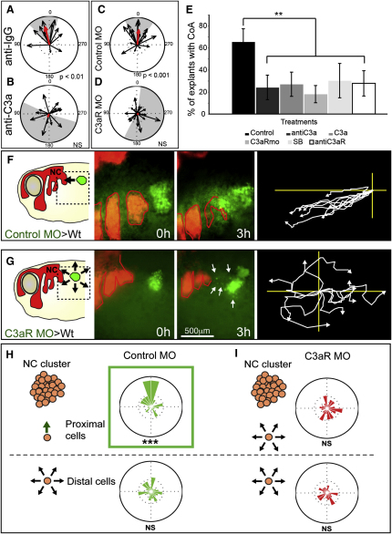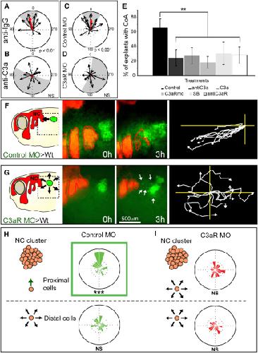 Figure 4. C3a and C3aR Mediate Coattraction(A–D) Vector plots showing that CoA in control IgG (A) is inhibited by a C3a via blocking antibody (B); and that normal CoA in control MO (C) is inhibited by C3aR MO (D).(E) Effect of different C3a/C3aR inhibitors on CoA (p < 0.01; n ∼20 for each experiment). The control bar includes measurements of control peptide (to control the effect of C3a), Rabbit-IgG (to control C3a and C3aR antibodies), control morpholino (to control C3aR MO), and DMSO (to control SB290157). No significant difference was found between different control treatments. Standard deviation obtained from three independent experiments. ∗∗p < 0.01. Error bars correspond to the standard deviation from the mean.(F and G) Loss of CoA in vivo. Left panel shows experiment scheme. Middle panels illustrate start and end point. Right panel indicates centered tracks. White arrows show dispersed single cells. (F) Grafts of control NC cells (green) join endogenous (red) NC cells (80%; n = 10). (G) Grafts of C3aR MO cells disperse radially (8%; n = 12).(H and I) Control or C3aR MO NC cells were dissociated into single cells and then scattered in the vicinities of differently labeled NC explants. Rose plots (green, control cells; red, C3aR MO cells). (H) Control cells proximal to the cluster (<300 μm) have a trend to migrate toward the cluster, whereas distant cells are not affected, and they move randomly. (I) Similar experiments for C3aR morphant NC cells show that these cells exhibited random migration, regardless of their distance to the explant.See also Figure S3 and Movie S5. |