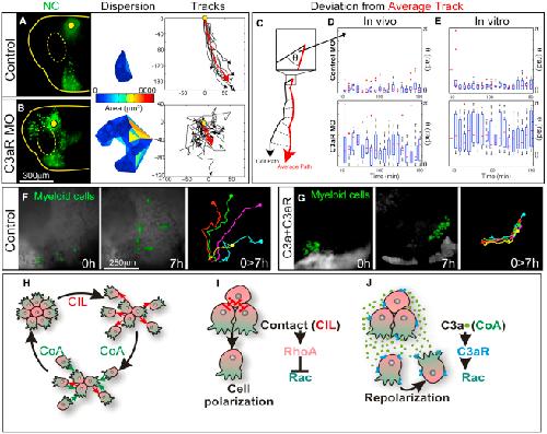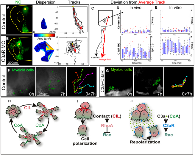 Figure 7. Coattraction Is Required and Sufficient for Collective Cell Migration(A) Analysis of cell migration via live imaging. Cell distribution (left), dispersion (middle), and migratory tracks (right) of control NC cells (green nuclei) after 10 hr of migration in vivo. Yellow lines indicate embryo and eye (dashed) outlines. Red line shows average track.(B) Similar to (A) but for C3aR MO NC cells.(C) Scheme to show the deviation angle from the average direction, θ.(D) Box plot showing the dispersion of θ for each time point.(E) Similar to (D) but for NC migrating in vitro.(F and G) Myeloid cells (green) migrate as individual cells (F) but turn to a more cohesive type of migration if coexpressing C3a and C3aR (G). Left panels show start and end of migration (time: 7 hr). Right panel illustrates representative tracks.(HâJ) Model of collective NC migration. (H) CIL leads to cell dispersion, whereas CoA keeps the cells together. A permanent cycle between CIL and CoA is required for collective migration. (I) CIL polarizes NC cells in a contact-dependent manner. This polarization is controlled by localized regulation of small GTPase activities, and allows a more efficient response to external signals. (J) CoA, which is C3a/C3aR dependent, repolarizes cells that are moving away from the cluster and thus keeps cells together. CoA involves activation of Rac and by bringing cells together allows CIL to start again, as depicted in (H).See also Figure S4 and Movies S7 and S8. |