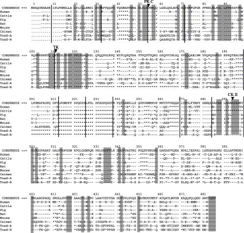 Amino acid sequence alignment of AMBNs from human, cattle, pig, rat, mouse, caiman and toad specimens. Amino acid residues are given in the IUPAC-IUB single-letter code. Numbering shows residue positions. Identity with the simple majority consensus sequence at the top is indicated by a dash (–) and deletions introduced for optimal alignment by asterisks (*). Potential phosphorylation residues (PK C, protein kinase C; TK, tyrosine kinase; CK 2, casein kinase II) are indicated by arrowheads. Vertical lines indicate exon borders of the human, caiman and toad AMBN genes. Parts completely identical in tetrapods are indicated by shaded boxes.