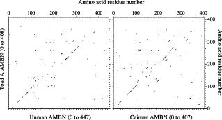 Dot-plot of toad-A amino acid sequence (ordinate), as compared to human and caiman AMBN sequences (abscissa). A single dot indicates four matching residues in a window of size 7.