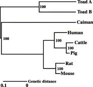 Neighbor-joining tree of amino acid sequences of AMBN proteins. The scale bar represents the distance based on the proportion of amino acid differences. Gapped sites were removed from all sequences before distance estimates were made. Numbers on the nodes indicate the percentage recovery of that node in 1000 bootstrap replications.