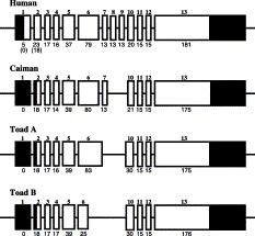 Exon–intron organization of AMBN genes in human, caiman and toad specimens. Shaded and open boxes indicate untranslated and translated exon regions, respectively. Coding lengths of exons with the number of amino acids are shown beneath the boxes. The number enclosed in parentheses beneath exons 1 and 2 in the schema of the human AMBN gene represent coding length, with the second Mets regarded as the start codon.