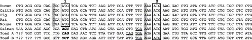 Nucleotide sequence alignment of 5′ regions of AMBN genes from various mammalian species, as well as caiman and toad specimens. The conserved start codons (ATGs) are boxed and the nucleotides in the −3 position are indicated by shaded boxes. The stop codons existing in the upstream regions of the start codons are underlined with a solid line.