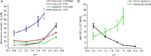 Survivin, a subunit of the chromosome passenger complex (CPC), binds the N-terminal tail of histone H3, which is phosphorylated on T3 by Haspin kinase, and localizes the complex to the inner centromeres. We used x-ray crystallography to determine the residues of Survivin that are important in binding phosphomodified histone H3. Mutation of amino acids that interact with the histone N-terminus lowered in vitro tail binding affinity and reduced CPC recruitment to the inner centromere in cells, validating our solved structures. Phylogenetic analysis shows that nonmammalian vertebrates have two Survivin paralogues, which we name class A and B. A distinguishing feature of these paralogues is an H-to-R change in an amino acid that interacts with the histone T3 phosphate. The binding to histone tails of the human class A paralogue, which has a histidine at this position, is sensitive to changes around physiological pH, whereas Xenopus Survivin class B is less so. Our data demonstrate that Survivin paralogues have different characteristics of phosphospecific binding to threonine-3 of histone H3, providing new insight into the biology of the inner centromere.