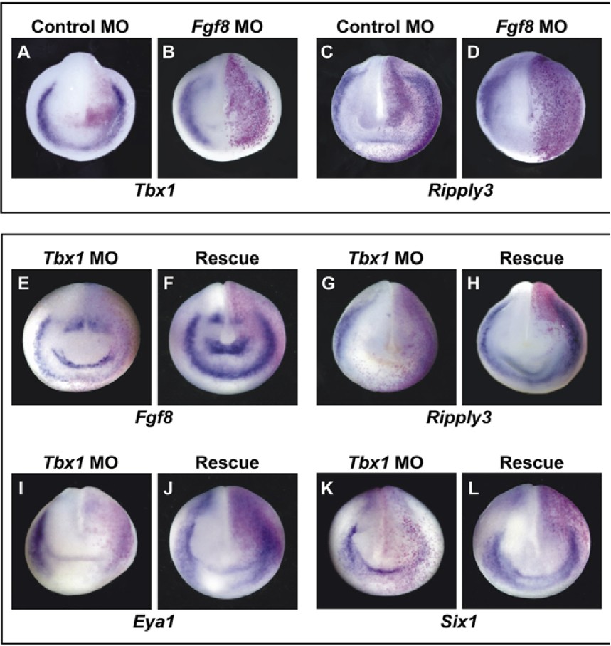 Fig. 7. FGF8 establishes the PPE, but TBX1 maintains Fgf8 expression. All embryos were injected unilaterally at the two- or four- cell stage. The injected side is on the right. (A,C) Control expression of Tbx1 and Ripply3. (B,D) Embryos injected with 30 ng Fgf8 splice MO; Tbx1 (8/16 embryos) and Ripply3 (19/23) expression were knocked down or knocked out. (E,G,I,K) Embryos injected with 10 ng Tbx1 MO showed knockdown of Fgf8 (12/16 embryos), Ripply3 (17/21), Eya1 (21/26) and Six1 (25/36) expression. (F,H,J,L) 10 ng Tbx1 MO + 0.5 ng Tbx1 mRNA rescued Fgf8 (5/8), Ripply3 (6/8), Eya1 (6/8) and Six1 (8/11) expression. |