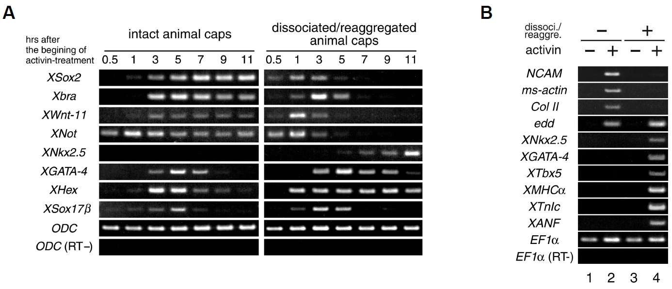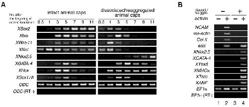 level. ODC, loading control; (RT-), negative control lacking reverse transcriptase. (B) Gene expression patterns in the intact or reaggregated animal caps