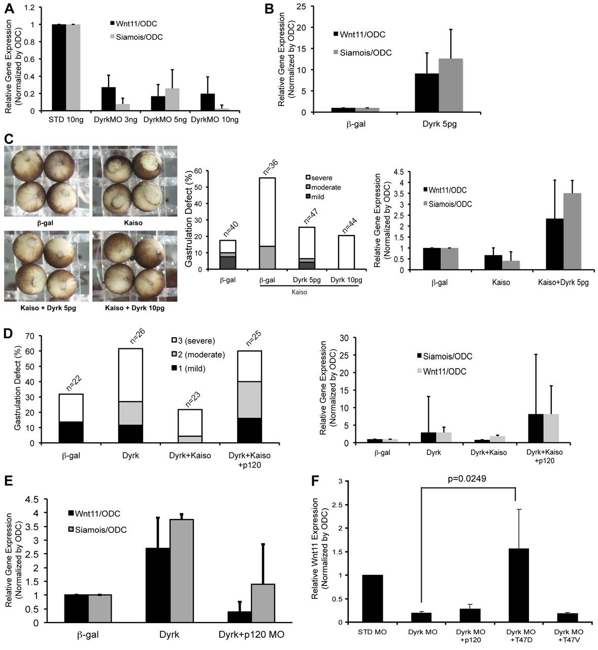 The Wnt pathways contribute to many processes in cancer and development, with β-catenin being a key canonical component. p120-catenin, which is structurally similar to β-catenin, regulates the expression of certain Wnt target genes, relieving repression conferred by the POZ- and zinc-finger-domain-containing transcription factor Kaiso. We have identified the kinase Dyrk1A as a component of the p120-catenin-Kaiso trajectory of the Wnt pathway. Using rescue and other approaches in Xenopus laevis embryos and mammalian cells, we found that Dyrk1A positively and selectively modulates p120-catenin protein levels, thus having an impact on p120-catenin and Kaiso (and canonical Wnt) gene targets such as siamois and wnt11. The Dyrk1A gene resides within the Down's syndrome critical region, which is amplified in Down's syndrome. A consensus Dyrk phosphorylation site in p120-catenin was identified, with a mutant mimicking phosphorylation exhibiting the predicted enhanced capacity to promote endogenous Wnt-11 and Siamois expression, and gastrulation defects. In summary, we report the biochemical and functional relationship of Dyrk1A with the p120-catenin-Kaiso signaling trajectory, with a linkage to canonical Wnt target genes. Conceivably, this work might also prove relevant to understanding the contribution of Dyrk1A dosage imbalance in Down's syndrome.