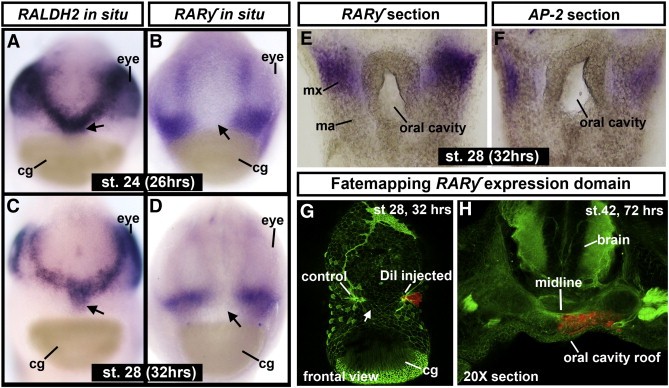 Fig. 2. AâD) frontal views of tadpole faces showing whole mount in situ hybridizations of RALDH2 (A,C) and RARγ (B,D) mRNA expression. The cement gland (cg) is pseudo-colored brown. The arrow points to the stomodeum. E,F) Transverse sections of RARγ mRNA expression and neural crest marker AP-2 in the orofacial region. G,H) DiI (red) fate mapping and phalloidin counterstaining labeling all F-actin (green). G) A frontal view of a tadpole fixed immediately post labeling with DiI in the RARγ expression domain at stage 28 (corresponding to panel D). The arrow points to the stomodeum. H) DiI labeling in transverse section approximately 40 h post labeling. DiI is observed in the primary palate region dorsal to the oral cavity. Abbreviations: cg; cement gland. |