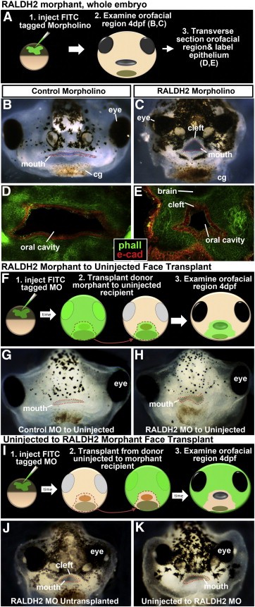 Fig. 3. A) Schematic showing experimental plan for BâE. B,C) Frontal view of tadpoles at 4 dpf showing the embryonic mouth outlined in red dots. D,E) Transverse sections of the orofacial region. E-cadherin labels the epithelium (red), counterstained with phalloidin (green). F) Schematic showing experimental plan for face transplants from morphant to un-injected sibling. G,H) Frontal views of tadpoles showing the embryonic mouth outlined in red dots 2 days after transplant procedure. I) Schematic showing experimental plan for face transplants from un-injected to morphant sibling. J,K) Frontal views of tadpoles showing the embryonic mouth outlined in red dots 2 days after transplant procedure. Abbreviations: cg; cement gland. |
