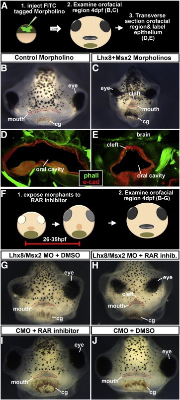 Fig. 6. A) Schematic showing experimental plan for BâE. B,C) Frontal view of tadpoles at 4 dpf showing the embryonic mouth outlined in red dots. D,E) Transverse sections of the orofacial region. E-cadherin labels the epithelium (red), counterstained with phalloidin (green). F) Schematic showing experimental plan to determine synergy of RAR inhibition and Lhx8/Msx2 loss of function. GâI) Frontal views of tadpoles showing the embryonic mouth outlined in red dots, 2 days after RAR treatment. Abbreviations: cg; cement gland. |