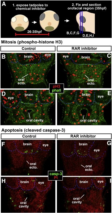 Fig. 7. AâD) Transverse sections through the dorsal facial prominences showing phospho-histone H3 immunohistochemistry (pH3; green) counterstained with propidium iodide (red). The brain and nasal pits are outlined in white dots. pH3 positive cells were counted in the region below the white dots. E) Schematic showing experimental plan for FâI. FâI) Frontal views of tadpoles at 4 dpf showing the embryonic mouth outlined in red dots. Abbreviations: cg = cement gland. |